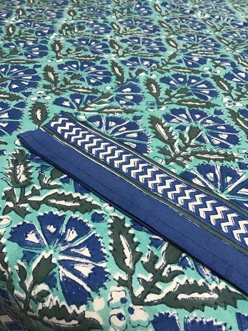 Block tablecloth 60x90 Machine wash cold. Gentle cycle. Do not bleach. Air dry. Handblock printed table cloths. 100% cotton