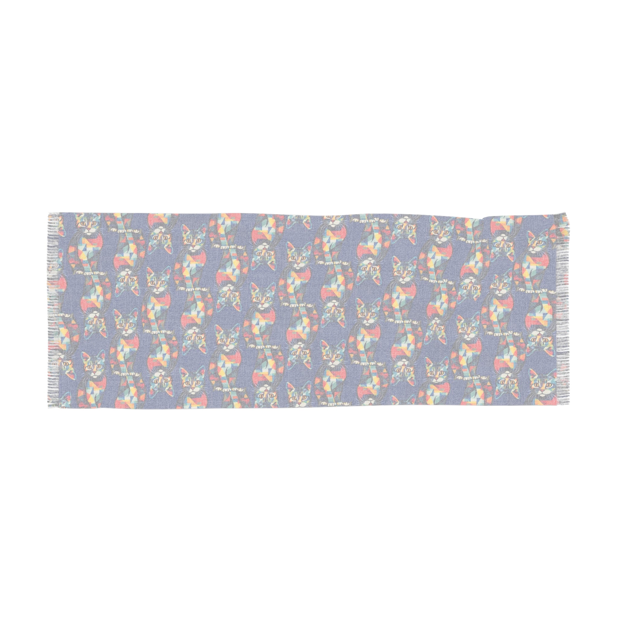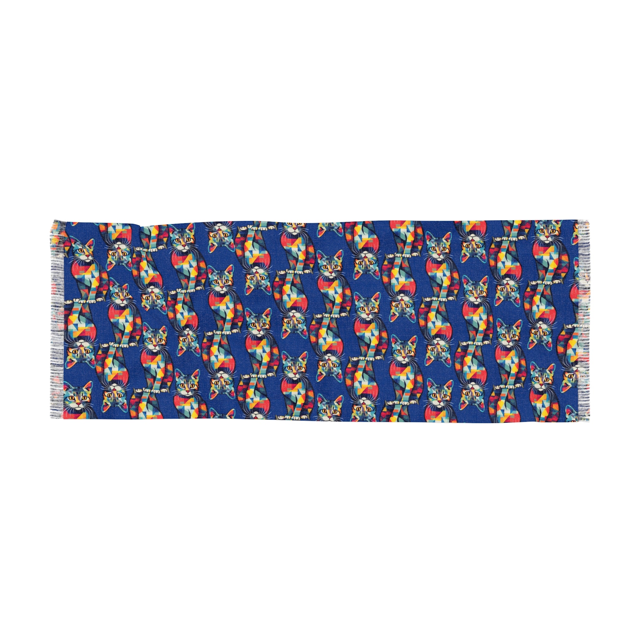 This scarf exudes a fun and vibrant vibe, perfect for adding a pop of color to any outfit. Ideal for cat lovers looking to showcase their love for felines in a stylish way. Great for casual wear or as a statement piece for cat-themed holidays and events.