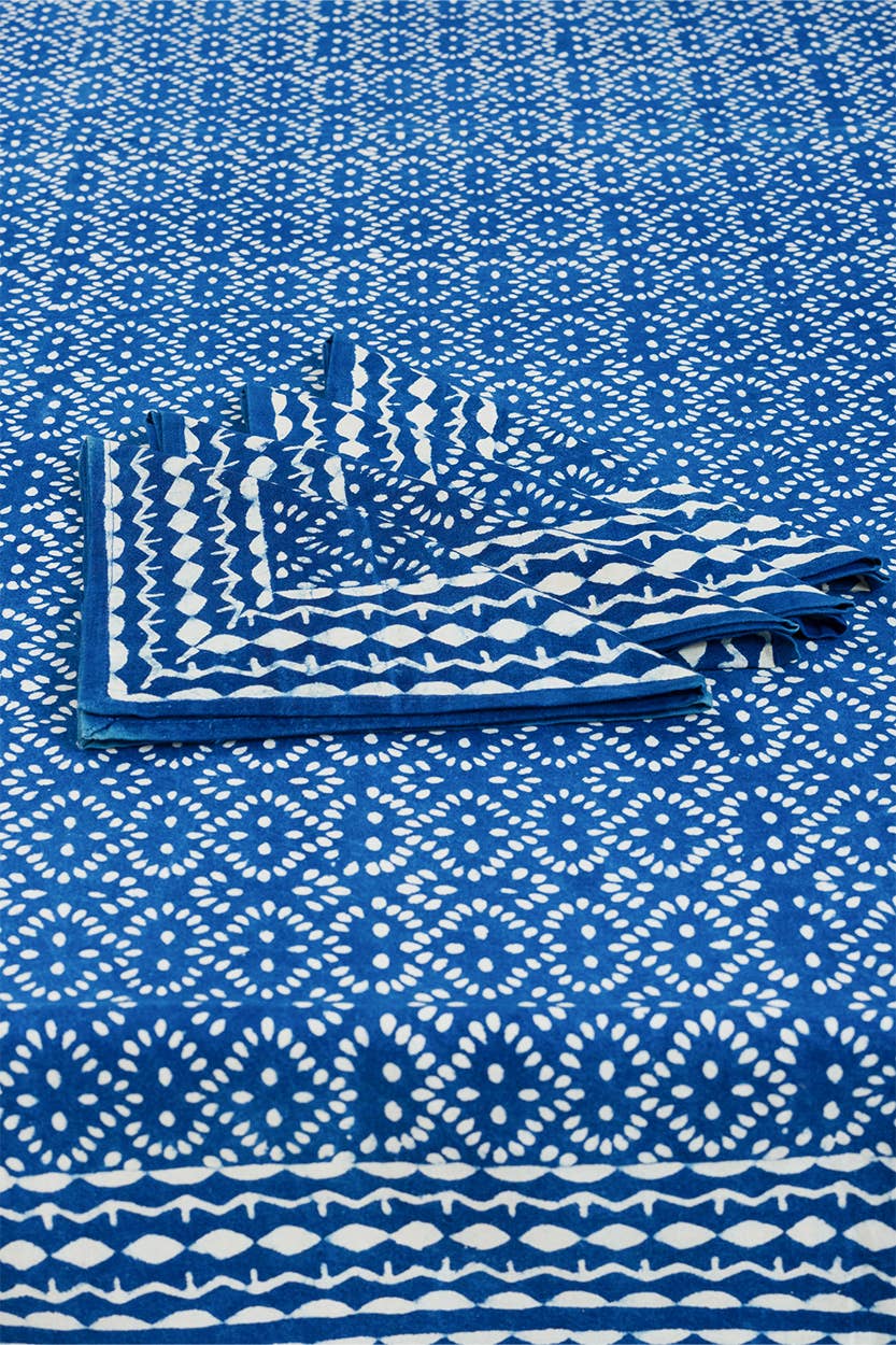 Our Indigo Tablecloth is made with soft 100% cotton that is hand block printed by artisans in Rajasthan, India using the traditional mud resist printing technique known as “dabu printing”. This art form has been practiced in India for centuries and is a very intricate process involving many steps. The natural variations that occur with mud printing adds to the authentic beauty of each piece. These fair trade tablecloths can also be used as a twin bedspread and have matching table runners and napkins sets. Our cotton table linens are machine washable and showcase the beautiful block printing traditions of India with eco-friendly dyes. Napkins sold separately. Dimensions: 60" x 90"